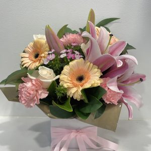 A box arrangement with lilies, roses, carnations and gerberas, in various shades of pink.