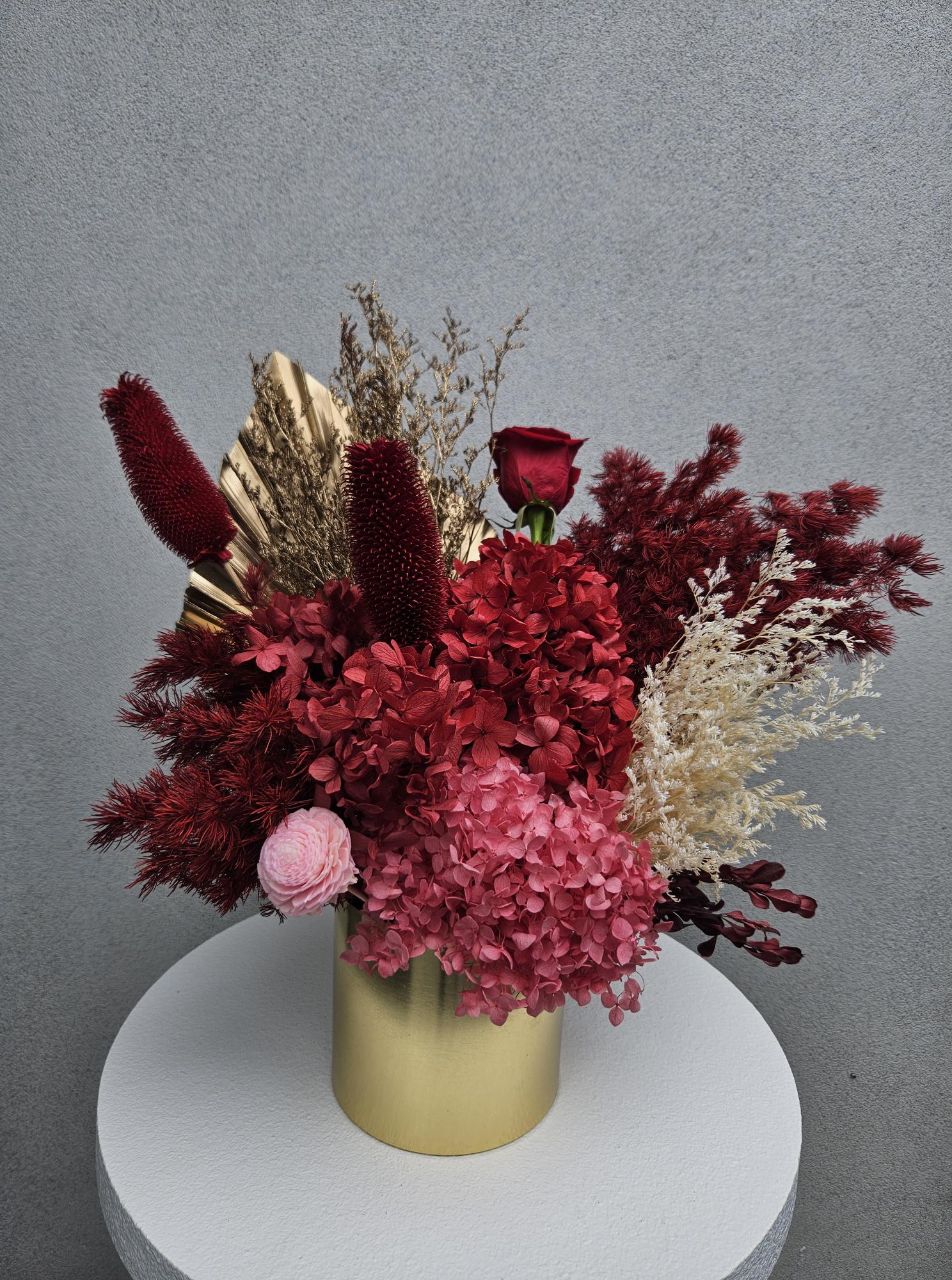A stunning preserved floral arrangement that makes a great heartfelt gift, bringing a touch of romance & sophistication to any space. Set in an elegant gold pot (12cm x 12cm), this modern arrangement consists of Hydrangeas, Ming fern, Misty, teasel.